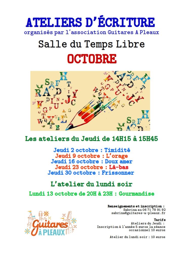 Renseignements et inscription : Sabrina au 06 71 78 91 92 ou sabrina@guitares-a-pleaux.fr