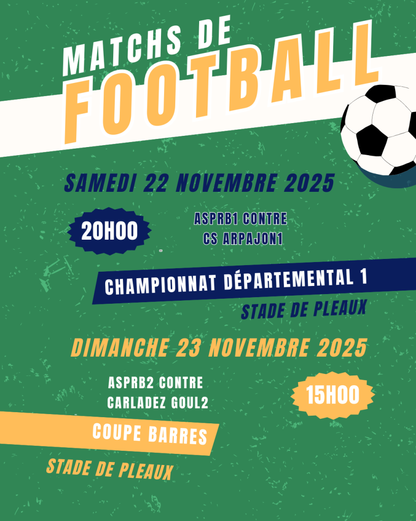 – samedi 8 novembre au stade de Pleaux à 20h, ASPRB 1 reçoit CS ARPAJON 1