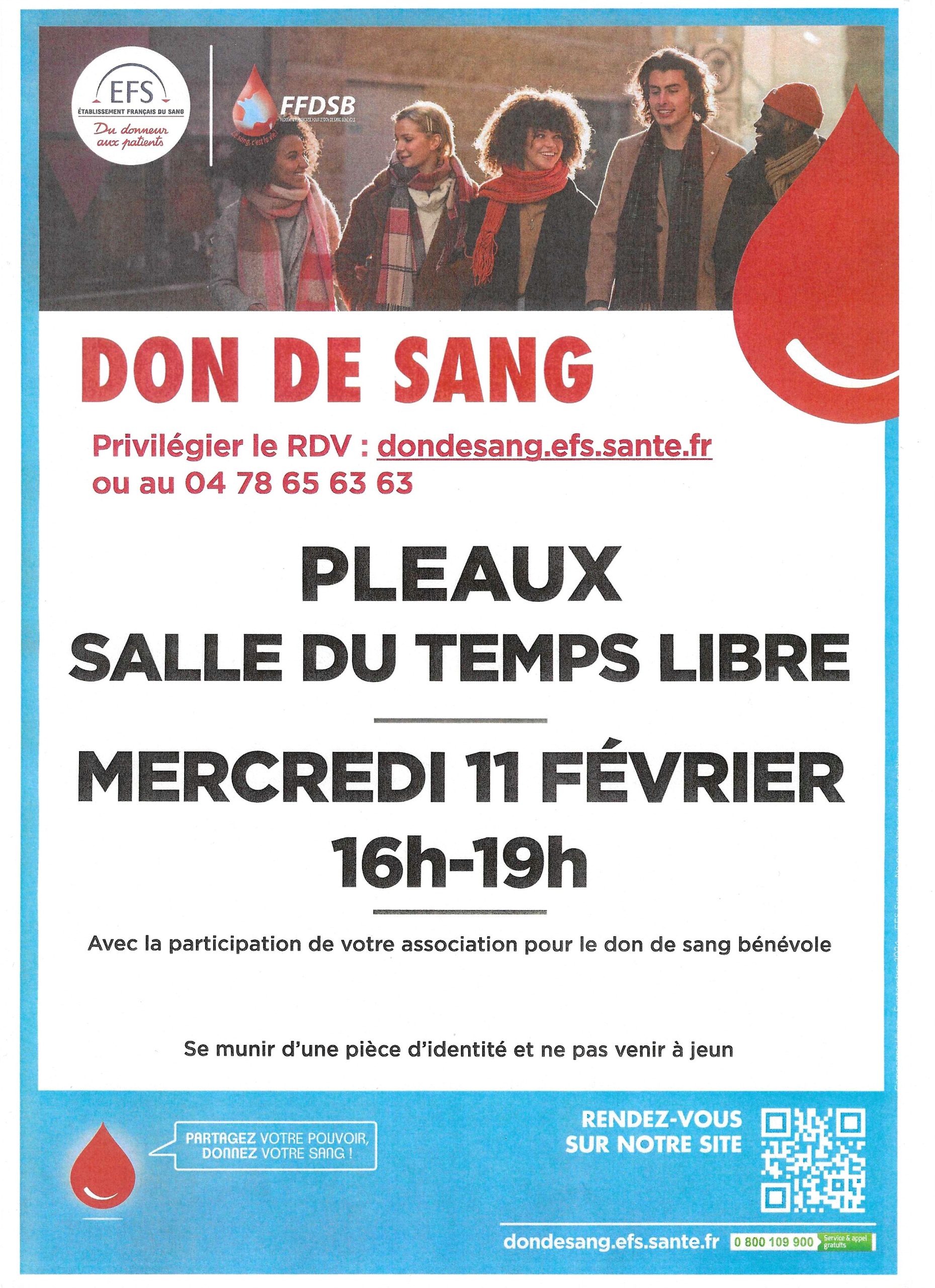 Collecte de 16 heures à 19 heures à la salle du Temps libre de Pleaux.