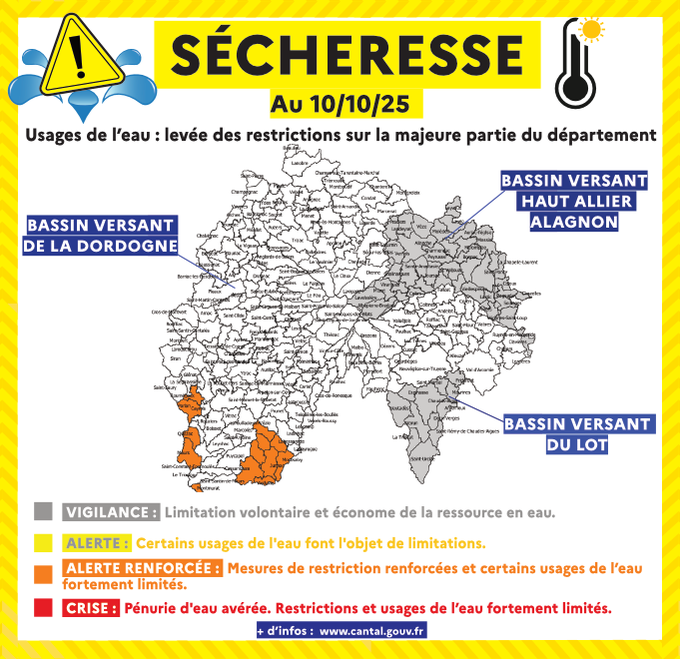Le préfet du Cantal a pris un nouvel arrêté n° 2025-1640 du 10 octobre 2025 qui limite les usages de l’eau (téléchargeable ci-après)